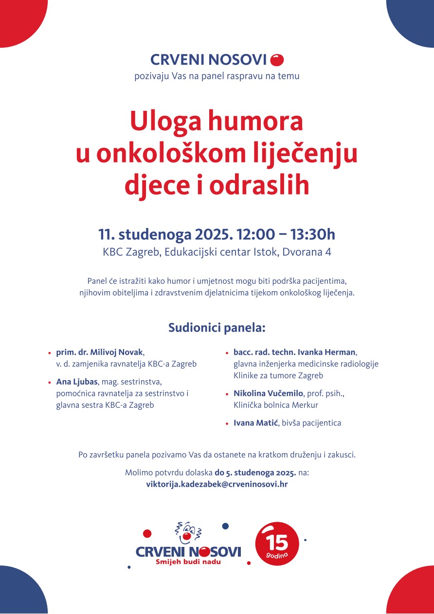 Prenosimo poziv na panel u organizaciji Crvenih nosova koji će se održati 11. studenog 2025 godine u KBC-u Zagreb, Edukacijski centar istok, Dvorana 4.