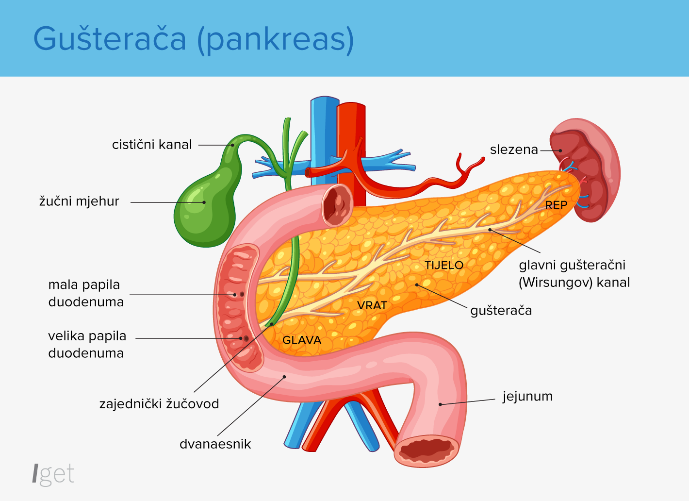 Kako bi u potpunosti ispunila svoju ulogu, gušterača ima dvije uloge, endokrinu i egzokrinu. Egzokrini dio gušterače proizvodi probavne sokove, koji kroz pankreasni vod ulaze u crijeva te omogućuju probavu hrane. Endokrini dio je zadužen za lučenje nekolicine hormona, između njih najbitnijih, inzulina i glukagona. Uz pomoć tih hormona, gušterača regulira krvni šećer. I endokrini i egzokrini dio mogu zahvatiti tumori.